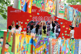 5月25日,小朋友把寫有給災(zāi)區(qū)孩子寄語的紙條貼在簽名墻上。當日,杭州市舉辦“我與奧運同行”少兒書畫攝影創(chuàng)意大賽優(yōu)秀作品展示暨賑災(zāi)義賣活動,近500幅參賽作品和部分獲獎選手現(xiàn)場創(chuàng)作的作品參加義賣,所得款項將捐給四川地震災(zāi)區(qū)的孩子。