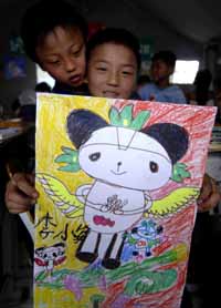 一名小學生在位于綿陽市九洲體育館的帳篷小學內(nèi)展示自己創(chuàng)作的以奧運為題材的繪畫作品。