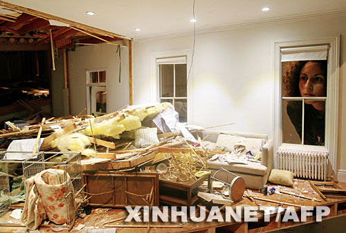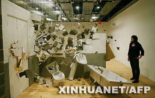 | 5月27日,在英國倫敦的黑瓦德畫廊,一名參觀者欣賞一間爆炸式房屋。