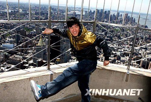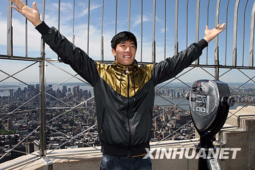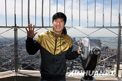5月28日,在美國(guó)紐約帝國(guó)大廈86層觀景平臺(tái),劉翔擺出姿勢(shì)供媒體拍攝。