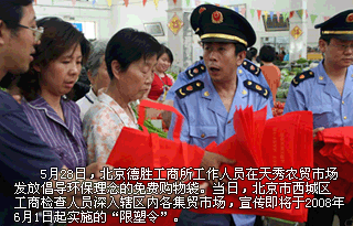 | 為配合6月1日將實(shí)行的“限塑令”,西安市各大賣(mài)場(chǎng)將對(duì)拎布袋子、菜籃子的消費(fèi)者實(shí)行多種形式的優(yōu)惠,來(lái)鼓勵(lì)大家減少使用塑料袋、減少白色污染。
