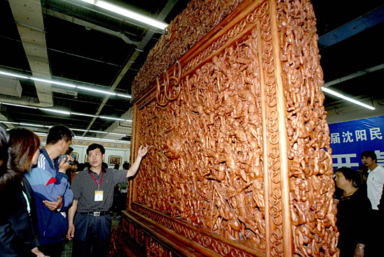近日,以“喜迎北京奧運盛會,展示民間藝術精品”為主題的2008年沈陽民間藝術博覽會在遼寧工業(yè)展覽館開幕,展品包括工藝品、珠寶和收藏品三大類。圖為一位參展商向參觀者介紹大型奧運主題梨木屏風雕刻。