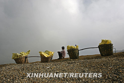 6月1日,在印度尼西亞東爪哇省,一名硫磺礦工在挑運途中休息。這些礦工肩挑50到100公斤重的硫磺,徒步8公里運往硫磺收集中心,每人每天大約可有7美元的收入。 新華社/路透