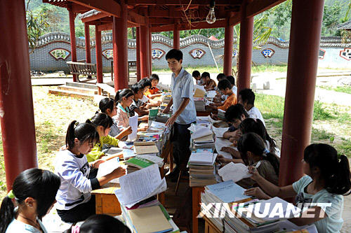 6月3日,陜西漢中青木川鎮(zhèn)輔仁中學(xué)英語老師在校園走廊里輔導(dǎo)學(xué)生。