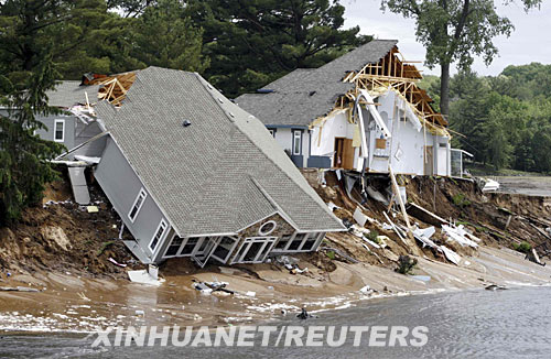 6月9日,在美國威斯康星州,一個人工湖的大壩因暴雨垮塌,決堤的湖水和雨水沖毀了附近的幾所住宅。 新華社/路透