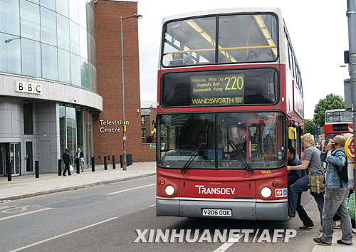 6月11日,在英國(guó)倫敦,幾名乘客在英國(guó)廣播公司(BBC)總部前乘車(chē)。