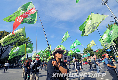 6月16日,韓國首爾的集會者舉著各自工會的旗幟,抗議油價不斷攀升。新華社/法新