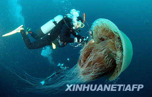 這張2006年10月4日拍攝的照片顯示,在日本北部石川縣小松海邊,一位潛水員在一只水母身上系上傳感器。新華社/法新 | |