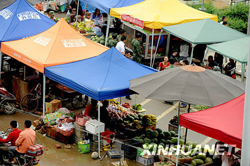 6月19日,群眾在青川縣縣城濱江道上的帳篷市場一條街上購物。四川省青川縣在受災(zāi)群眾安置集中地點(diǎn)——青川縣城濱江道設(shè)立帳篷市場一條街,滿足受災(zāi)群眾的生產(chǎn)生活實(shí)際需要。