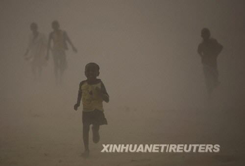 6月19日,在乍得東部的一個難民營,一名小男孩在沙塵暴中奔向自己的住所。
