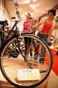 6月21日,觀眾在參觀展出的中國產(chǎn)飛鴿牌自行車。當(dāng)日,為迎接北京奧運(yùn)會(huì),即將于今年10月建成的河北霸州自行車博物館啟動(dòng)了迎奧運(yùn)先期預(yù)展活動(dòng)。