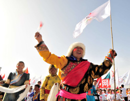 6月22日,蒙古族群眾在慶祝圣火傳遞。當(dāng)日,北京奧運(yùn)會(huì)圣火在青海省格爾木傳遞。