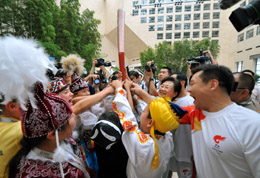 日前,56個(gè)民族小使者來到中國銀行總行大廈,“零距離”觸摸了一把“祥云”火炬。