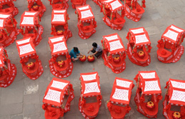 6月22日,在山西省平遙古城的迎薰門南廣場,兩名婦女在為“彩船”準(zhǔn)備燈籠,以迎接北京奧運(yùn)會(huì)圣火傳遞活動(dòng)的舉行。