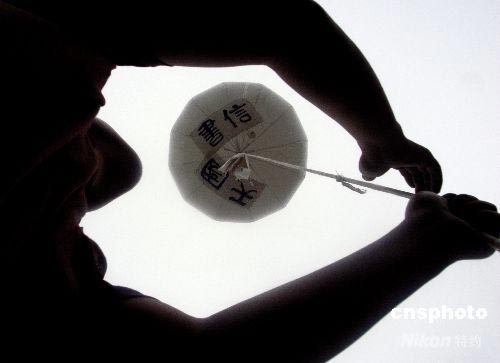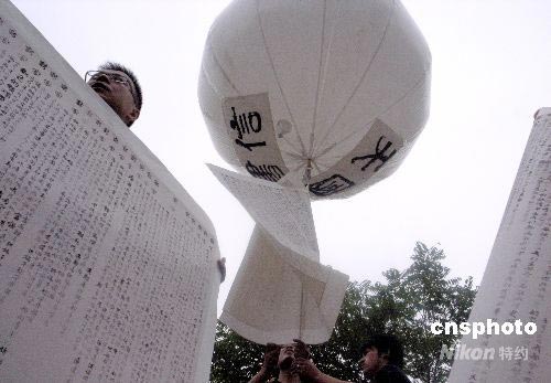 6月29日下午2點28分,北京藝術(shù)家朱永靈在北京798藝術(shù)區(qū)為四川地震遇難者放飛“天國書信”。這些書信摘抄自汶川大地震紀念館網(wǎng)站上網(wǎng)民為地震遇難者所寫的留言。