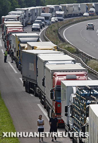6月30日,在法國斯特拉斯堡附近,一條公路被卡車堵塞。