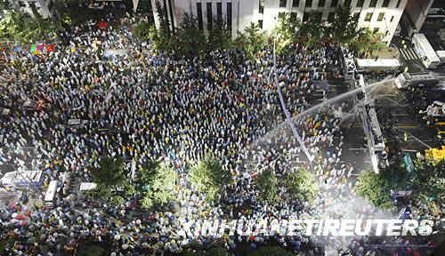 6月28日,在韓國首都首爾,防暴警察用水槍和消防栓噴水以驅(qū)散抗議隊(duì)伍。新華社/路透