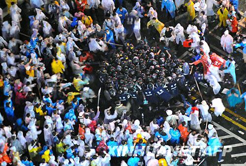 6月29日,在韓國首都首爾,抗議人群將防暴警察圍在中央。新華社/法新