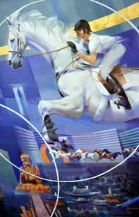 6月29日,繼《喝彩—中國奧運百年圓夢》《北京千年城市風景畫》后,澳大利亞著名奧運畫家查爾斯·比利奇又一幅力作《香港—2008》風景畫亮相京城。畫作高1.2米、寬4.8米,以香港作為2008年奧運會馬術運動比賽地為主題。圖為作品局部。