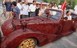 日前,開封青年雕刻家朱雪耗時兩年時間雕刻完成的“奧運和諧號”藝術車在鄭州文廟廣場前展出。這臺以老爺車軀干為骨架的藝術車使用了1000公斤紅木,雕刻出雙龍、華表、天安門、奧運五環(huán)、中國印以及福娃等中國元素和奧運符號。