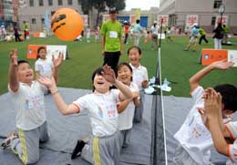 6月28日,社區(qū)小朋友在體驗殘奧項目坐式排球運動。