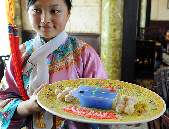 圖為身著清朝宮廷旗袍的北京聽鸝館飯莊服務員在展示體育造型菜品。