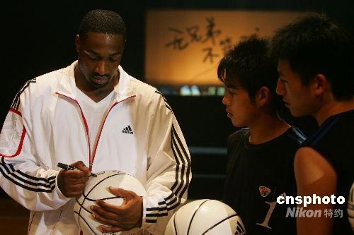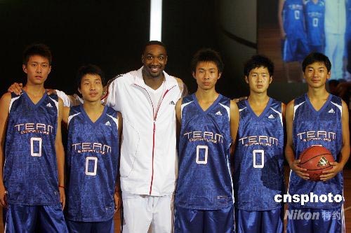 7月3日,NBA球星吉爾伯特·阿里納斯在上海出席阿迪達(dá)斯2008夏季籃球聯(lián)賽全國(guó)總決賽開(kāi)幕式,一支來(lái)自汶川的高中籃球隊(duì)得到了吉爾伯特·阿里納斯的特別“照顧”,傳授球技、合影留念,吉爾伯特·阿里納斯(左三)和這些小球員來(lái)了個(gè)“親密接觸”。