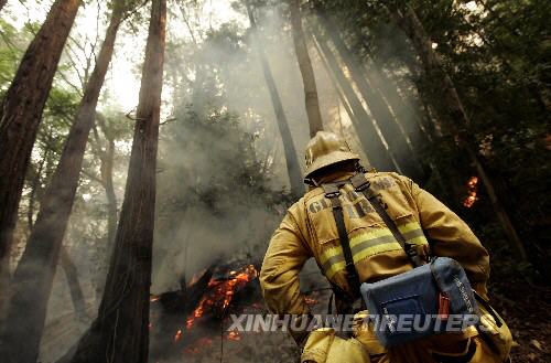 7月6日,在美國加利福尼亞州的大瑟爾,一名消防員觀望火勢。新華社/路透