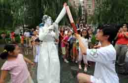 7月5日,一名扮演希臘女祭祀的少女“點(diǎn)燃”北京奧運(yùn)火炬手高銘華(右)手中的火炬。