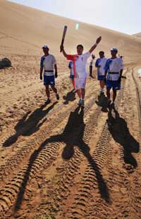 7月5日,火炬手劉巖手持火炬進(jìn)行傳遞。當(dāng)日,北京奧運(yùn)圣火在甘肅敦煌傳遞。