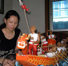 7月7日,陜西安康市新安職業(yè)中學女教師季夏對龍舟泥塑做最后的粘貼、完善。 季夏從小酷愛泥塑藝術,她耗時兩個月構(gòu)思創(chuàng)作出泥塑作品《龍舟競技》,表達對奧運的期盼。