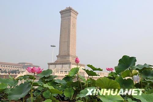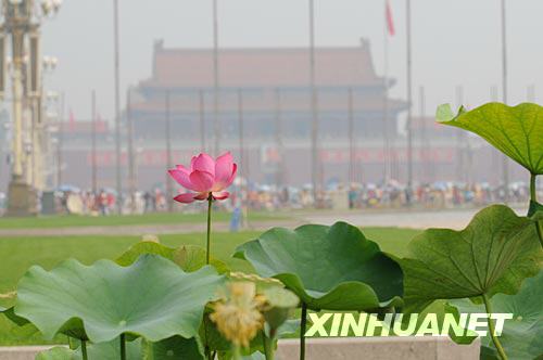 這是7月7日拍攝的北京天安門廣場上盛開的紅蓮。