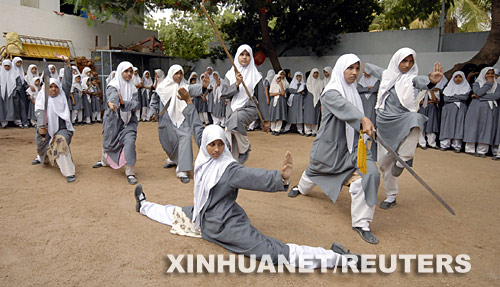7月8日,在印度南部城市海得拉巴的一所學(xué)校內(nèi),幾名女學(xué)生在練習(xí)中國武術(shù)。該校內(nèi)10歲至16歲的學(xué)生在上學(xué)期間,每周都進行武術(shù)學(xué)習(xí)。 新華社/路透