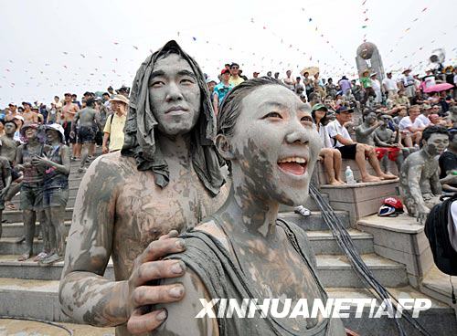 7月13日,在韓國(guó)保寧大川海水浴場(chǎng)舉行的泥漿節(jié)上,游客們將泥漿涂抹在身上。新華社/法新
