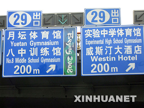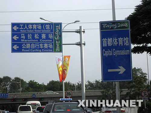 奧運一天天臨近,北京街頭有關(guān)奧運比賽體育館、訓(xùn)練館、飯店等的路標越來越多。