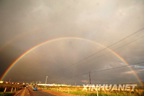 當(dāng)日晚7時(shí)30分左右,小雨過后,位于青海省海北藏族自治州的金銀灘草原上空出現(xiàn)罕見雙彩虹,顏色一深一淺,鮮艷奪目。