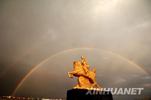 7月14日,絢麗彩虹掛在金銀灘草原一處雕塑上空。