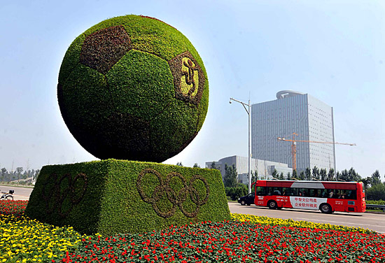 [進(jìn)入北京奧運(yùn)會專題] 沈陽奧體中心附近的一條街道上,矗立著一個(gè)以足球?yàn)樵煨偷幕ɑ艿袼。隨著奧運(yùn)會開幕日期臨近,在北京奧運(yùn)會分賽場之一的沈陽市,無論是城區(qū)還是旅游景點(diǎn),到處都能感受到濃郁的奧運(yùn)氛圍。