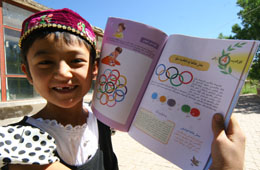 新疆哈密市天山鄉(xiāng)的少數(shù)民族小學生在展示剛領的《北京奧運會小學生讀本》。