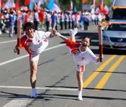 7月13日,火炬手徐銘(左)與火炬手方丹在交接后慶祝。當日,北京奧運火炬在黑龍江省齊齊哈爾市傳遞。