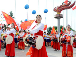 7月14日,演員們在起跑儀式現(xiàn)場進行表演。當日,北京奧運圣火在吉林省長春市傳遞。