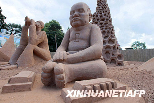 7月20日,拉脫維亞舉行國際沙雕節(jié)。這是拉脫維亞一名藝術家在沙雕節(jié)上創(chuàng)作的沙雕作品,名曰“小機器人制作微芯片沙餅”。 新華社/法新