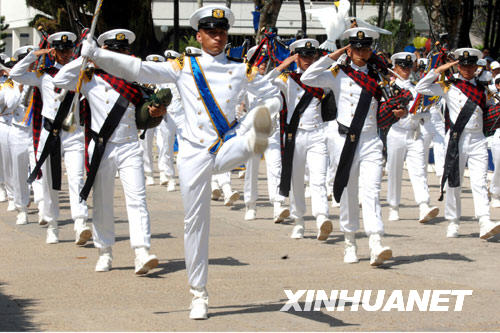 7月20日,在哥倫比亞萊蒂西亞,哥三軍儀仗隊(duì)接受檢閱。當(dāng)天,哥倫比亞舉行閱兵等活動(dòng)慶祝獨(dú)立198周年。哥總統(tǒng)烏里韋主持閱兵儀式,巴西總統(tǒng)盧拉、秘魯總統(tǒng)加西亞應(yīng)邀出席。