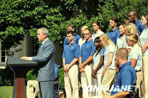7月21日,美國總統(tǒng)布什在送行儀式上講話。當(dāng)日,美國總統(tǒng)布什在白宮玫瑰園為美國奧運代表團(tuán)送行。
