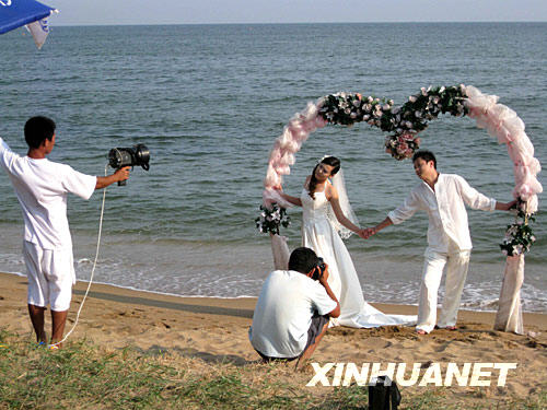 攝影師在北戴河海景婚紗攝影基地為新人拍照(7月19日攝)。進入暑期,度假勝地北戴河在一處海灘建立了海景婚紗攝影基地,只要天氣放晴,每天都有數(shù)十對新人在這里拍攝海景婚紗照。