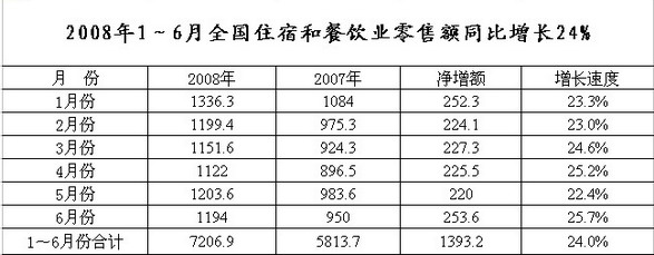 今年以來,全國住宿與餐飲業(yè)盡管受南方低溫雨雪冰凍、汶川大地震等嚴重自然災(zāi)害以及物價上漲、勞動力成本提高的影響,企業(yè)經(jīng)營出現(xiàn)一定程度的波動,但餐飲市場仍呈現(xiàn)出平穩(wěn)增長的良好態(tài)勢,預(yù)計全年餐飲市場仍將繼續(xù)保持快速發(fā)展。 據(jù)有關(guān)數(shù)據(jù)分析,上半年,全國住宿與餐飲市場持續(xù)高增長,零售額達到7207億元,同比增長24%,比上年同期加快6.2個百分點,占同期社會消費品零售總額的比重為14.1%,拉動社會消費品零售總額增長3.3個百分點。其中,6月份零售額實現(xiàn)1194億元,同比增長25.7%,環(huán)比下降0.8%,比上年同期加快7.2個百分點,比上月加快3.3個百分點。上半年住宿與餐飲業(yè)新設(shè)立外商投資企業(yè)338家,同比下降19.5%;合同外資金額14.1億美元,同比增長3.9%;實際使用外資金額5.1億美元,同比增長9.9%。其中,餐飲業(yè)實際使用外資金額2.2億美元,同比增長34.8%。 上半年餐飲市場主要特點:一是“農(nóng)家樂”餐飲倍受青睞。首次出現(xiàn)的“五一”、“清明”兩個小長假,帶動“農(nóng)家樂”休閑餐飲大幅增長,據(jù)監(jiān)測,農(nóng)家樂餐飲消費同比增長達到30%。二是婚宴現(xiàn)象突出。據(jù)監(jiān)測,今年春節(jié)、“五一”等假期,一些大中城市婚宴消費增幅達到30%以上。 根據(jù)餐飲市場運行規(guī)律,預(yù)測下半年餐飲市場快速增長的勢頭不會改變,特別是在第三季度,隨著北京奧運會的舉辦,全國住宿和餐飲消費需求有望明顯增加。預(yù)計第三季度住宿與餐飲業(yè)零售額將達到3800億元,同比增長24.7%;全年住宿與餐飲業(yè)零售額將達到15380億元,同比增長24.5%;全國人均餐飲消費支出將達到1158元,同比增長23.9%。