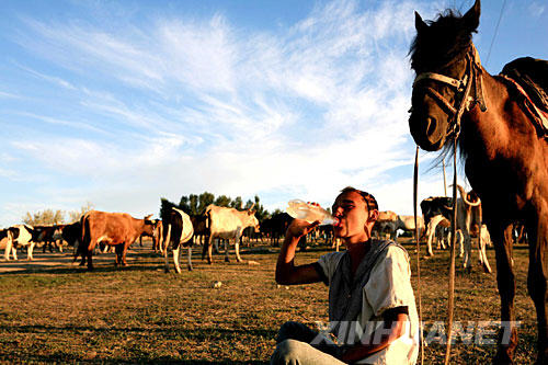 7月23日,新疆阿勒泰市阿葦灘鎮(zhèn)庫布西村牧民在一塊因干旱日漸退化的草場上放牧。新疆今年遭遇自1974年以來最為嚴(yán)重的旱災(zāi),全疆大部分地區(qū)春夏連旱已成定局,造成農(nóng)作物大面積絕收,2.8億畝草場干旱,畜牧業(yè)受災(zāi)嚴(yán)重。在旱情最為嚴(yán)重的塔城、阿勒泰兩地,受旱草場面積占到可利用草場面積的60%。 |