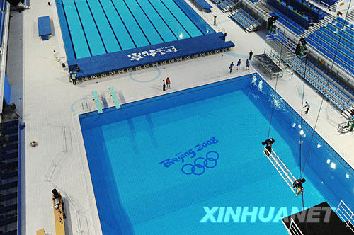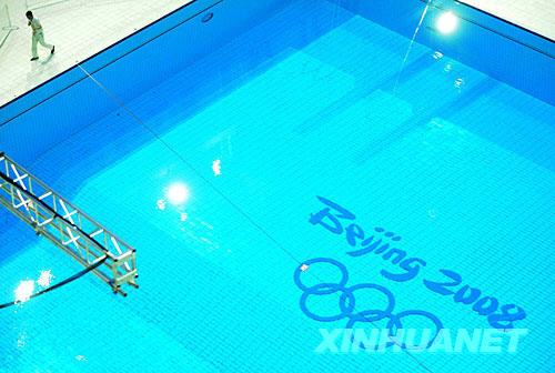 7月24日,工程人員在奧運(yùn)場館“水立方”跳水池中擺放奧運(yùn)標(biāo)志。當(dāng)日,“水立方”跳水池?cái)[放了“Beijing