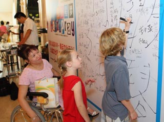 身著隊(duì)服的200名奧運(yùn)志愿者和來(lái)自中國(guó)殘聯(lián)、西城區(qū)殘聯(lián)的近300名殘障人士代表一同觀看了演出,F(xiàn)場(chǎng)觀眾們紛紛在演出現(xiàn)場(chǎng)的勵(lì)志留言板留言,祝福北京奧運(yùn)會(huì)圓滿成功,一批外國(guó)小觀眾也踴躍上前,寫(xiě)下了“北京奧運(yùn)成功”的祝福語(yǔ)。