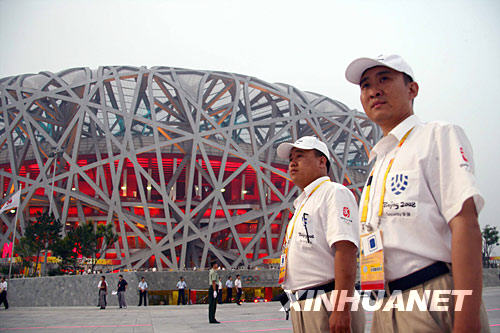 7月30日,兩名安保人員在執(zhí)勤。當晚,第29屆夏季奧運會開幕式在北京國家體育場進行封閉式彩排。奧運安保人員定崗定責在國家體育場接受實際檢驗。